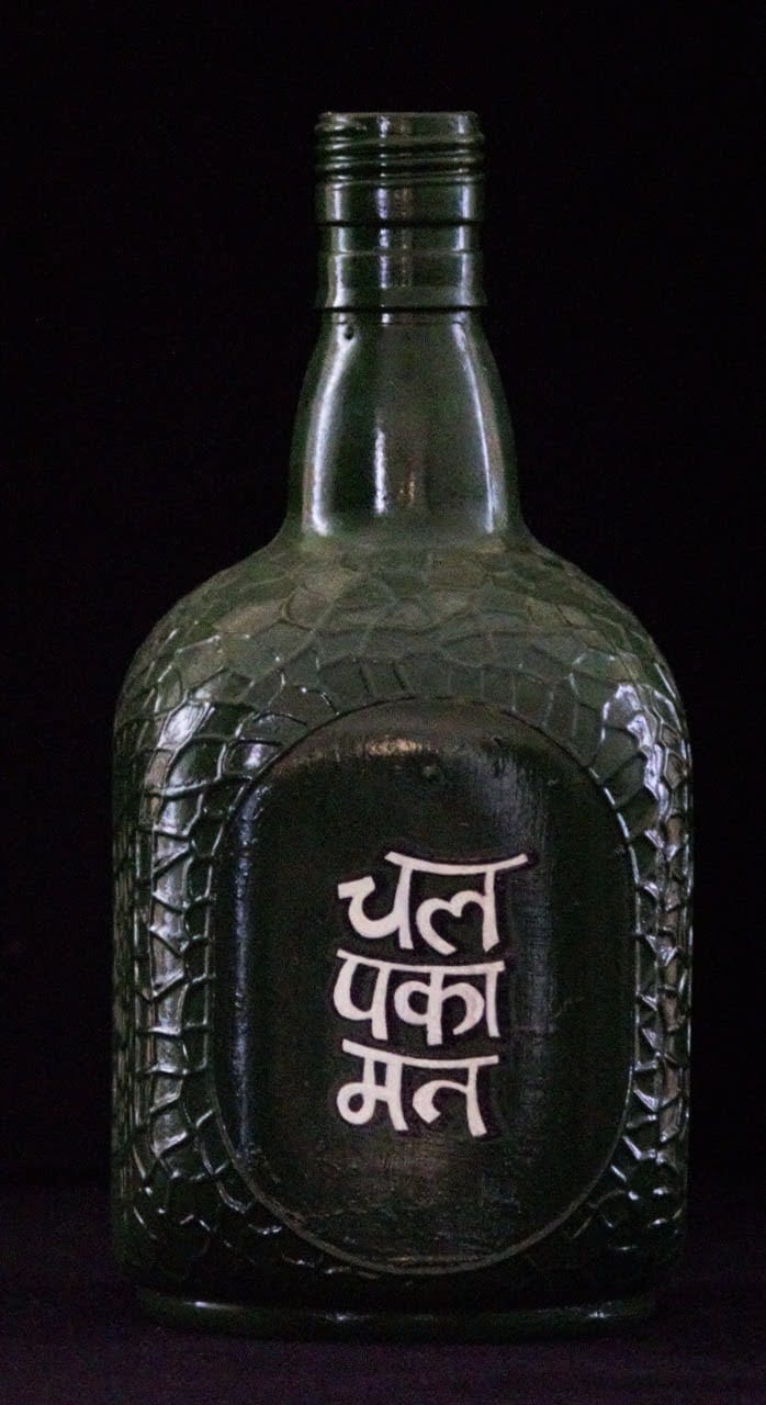 Add a bold dose of attitude and humor to your décor with “Chal Paka Mat”, a quirky hand-painted bottle that speaks your vibe loud and clear. Featuring the popular Hindi phrase in striking white lettering against a deep, textured dark base, this design blends minimalism with expressive street-style flair.