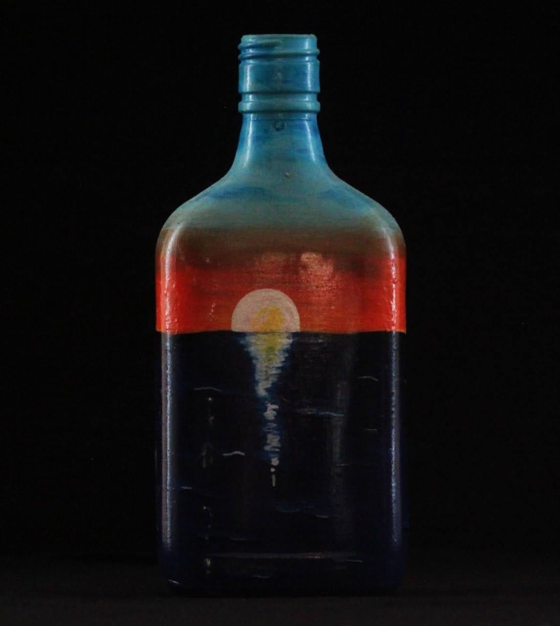 Crafted on a recycled glass bottle, this artwork blends sustainability with creativity, making it a perfect addition to eco-conscious homes. The smooth gradient of colors and the soft glow effect create a serene, almost meditative ambiance, whether displayed on a shelf, table, or as part of a décor arrangement.