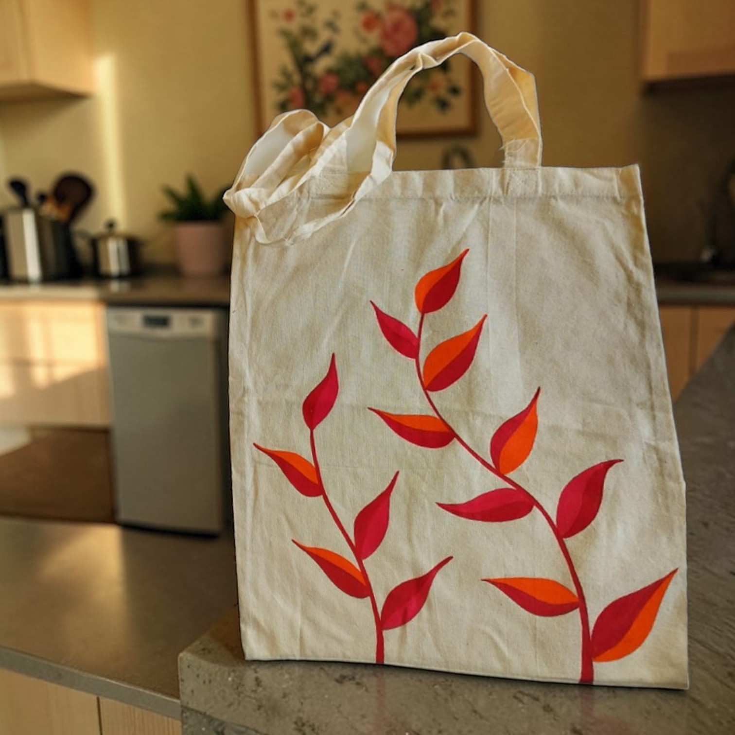A stylish and eco-friendly shopping tote bag featuring a bold hand-painted leaf design. Perfect for everyday use, grocery trips, and sustainable living.