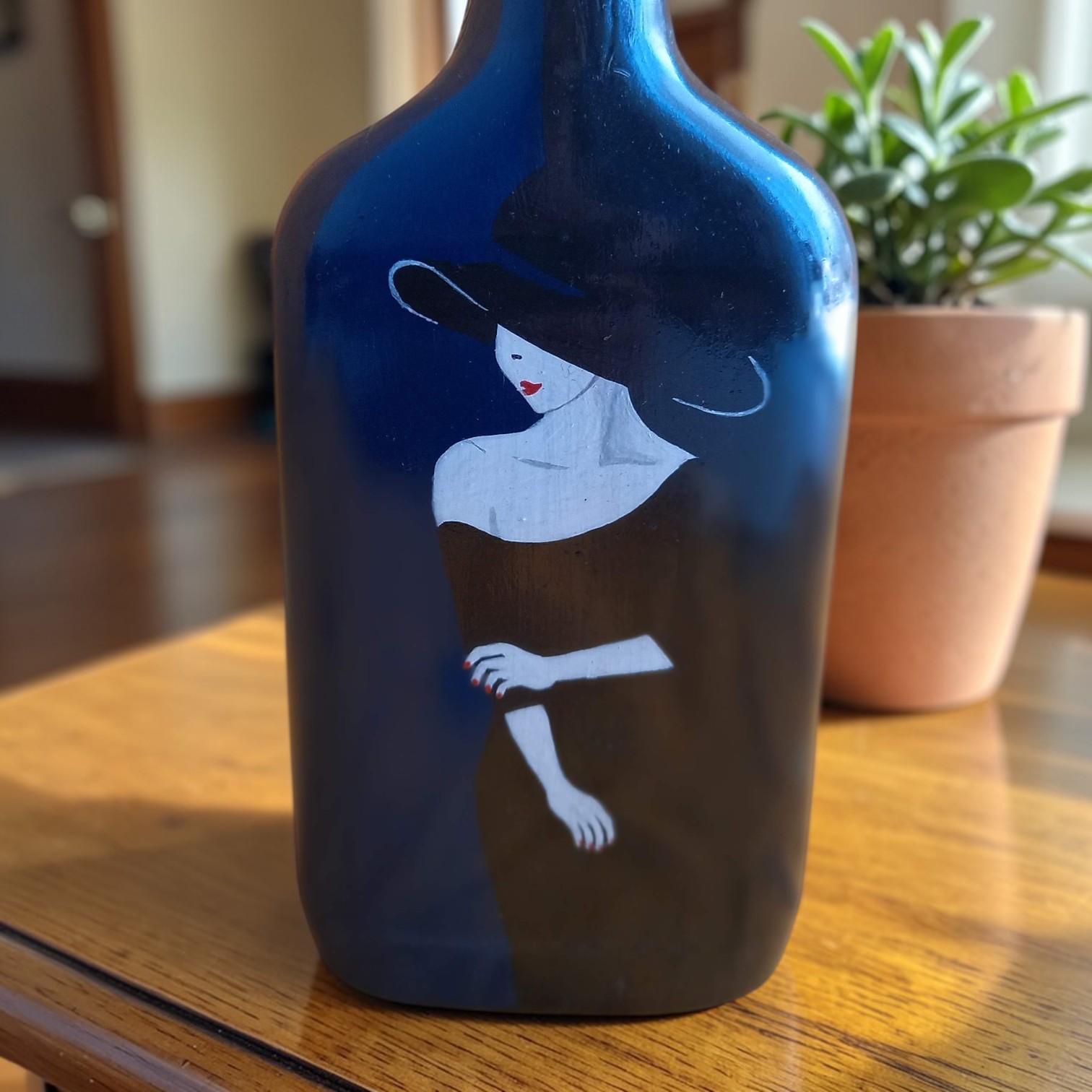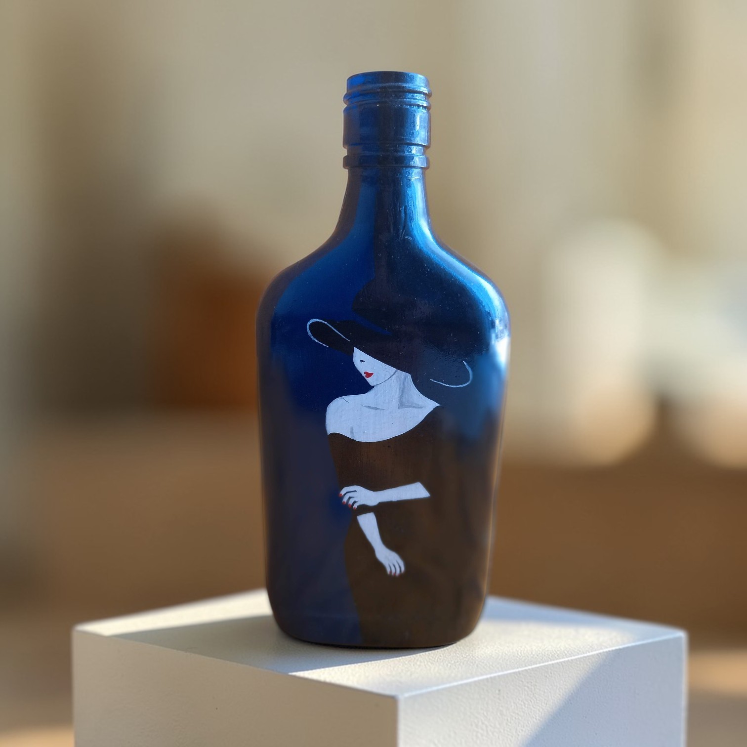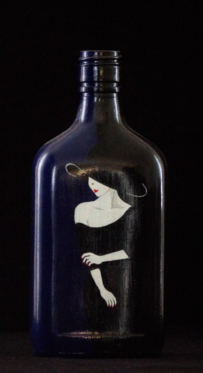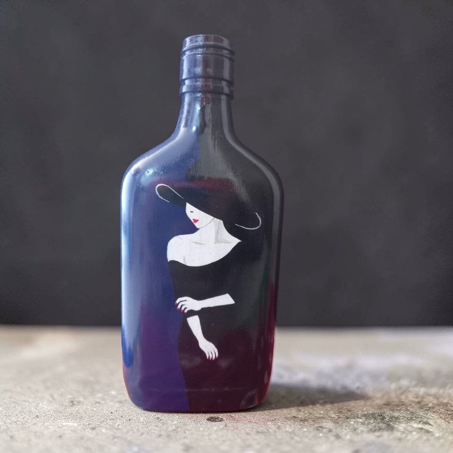 Bring elegance and sophistication to your space with this beautifully hand-painted decorative bottle featuring a graceful lady in a black dress and hat. The rich midnight blue background adds a luxurious touch, while the minimal artistic design gives it a modern and stylish look.