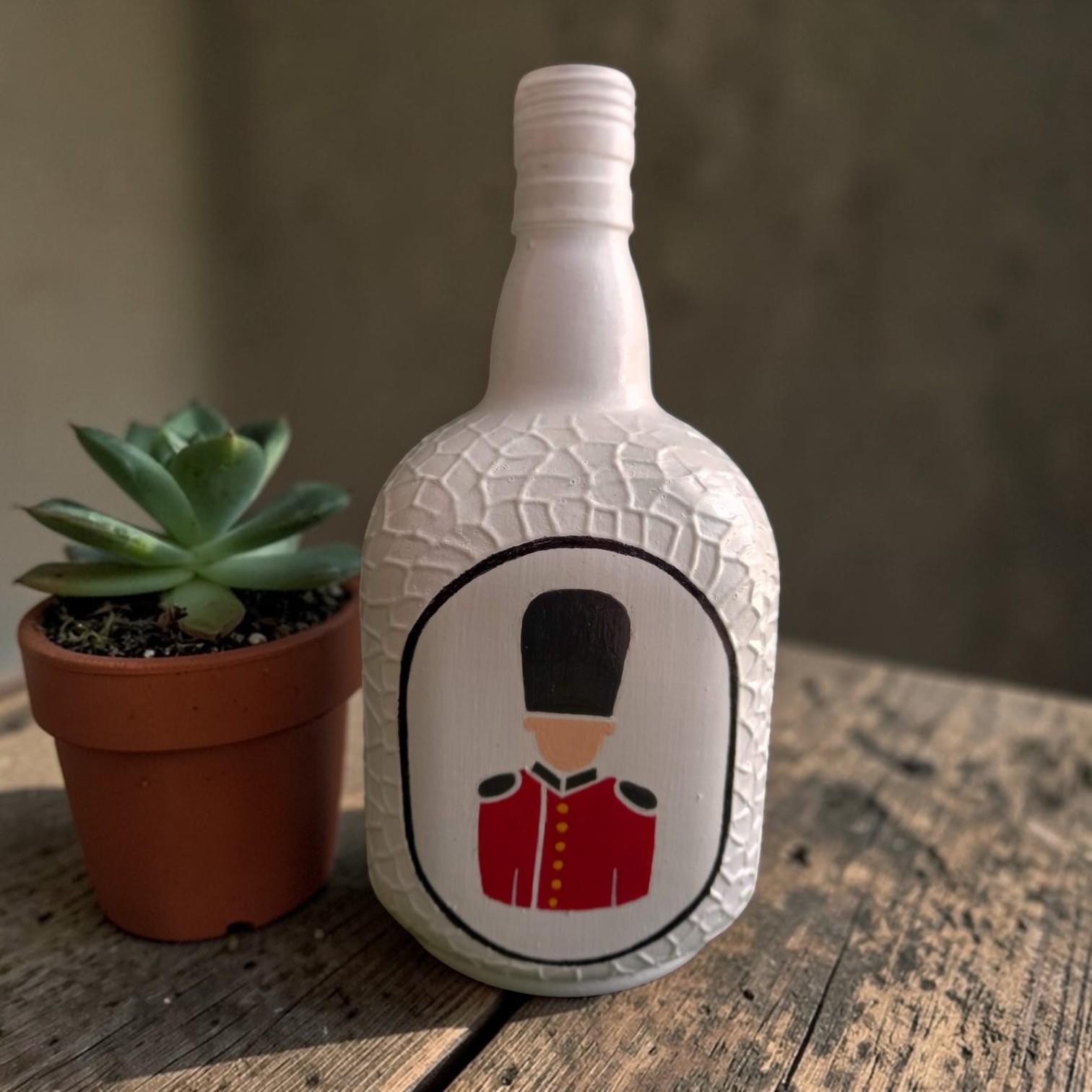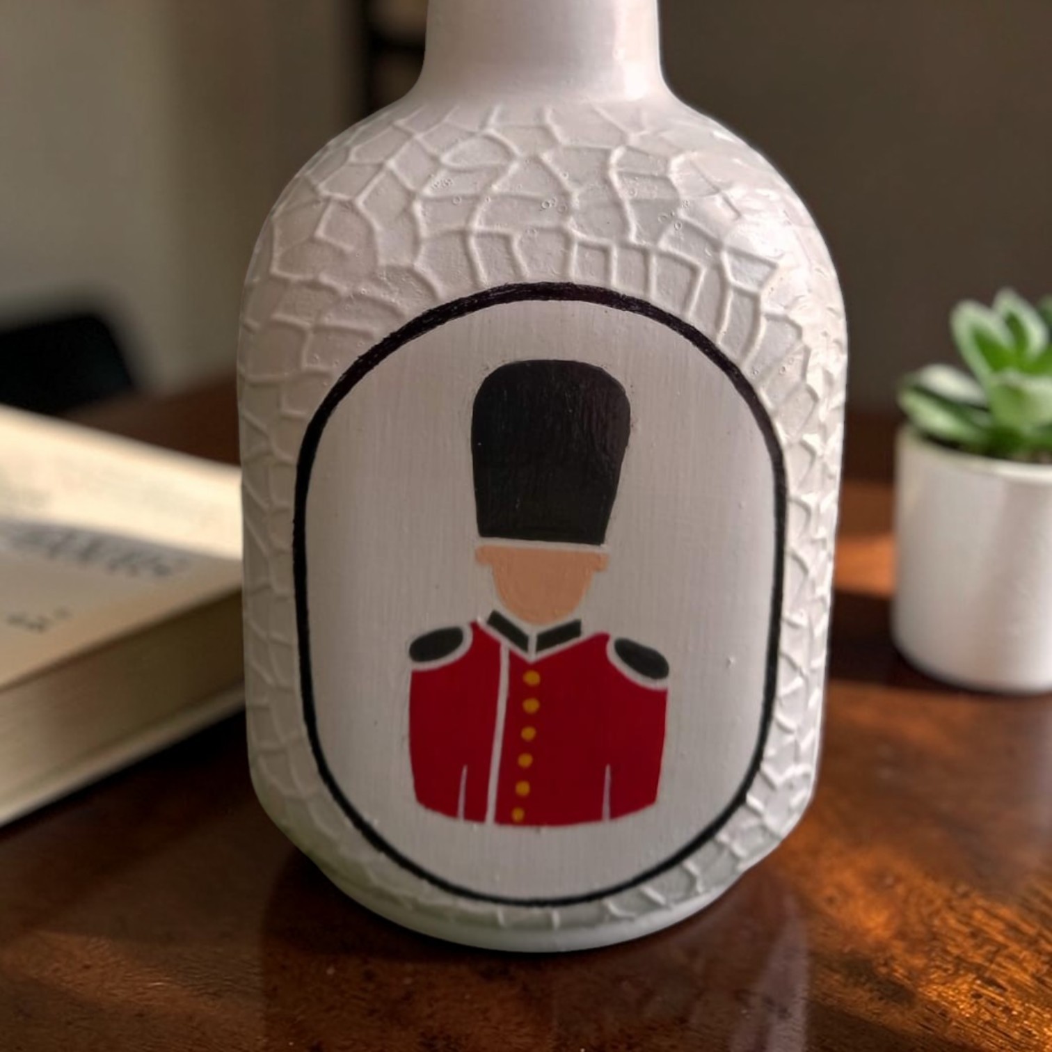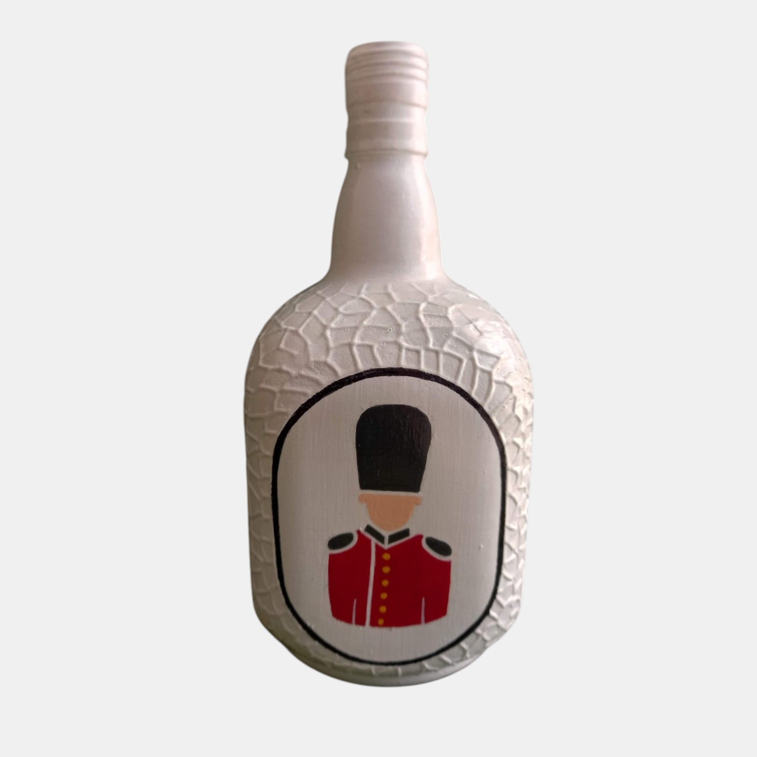 Add a royal touch to your home decor with this beautifully hand-painted decorative bottle featuring a classic guard-inspired design. The elegant white textured bottle paired with the iconic red uniform artwork creates a stylish and unique decorative piece.
