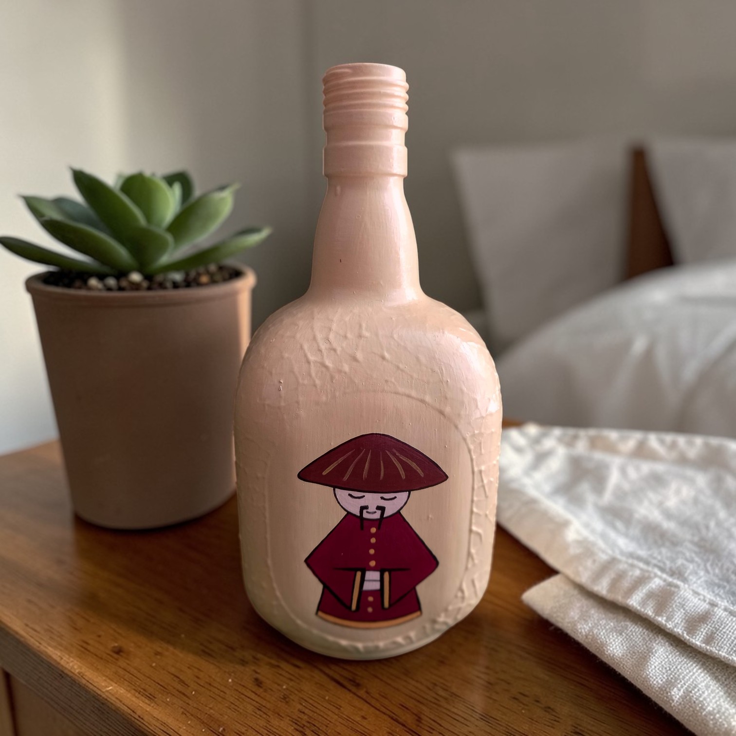 Add a calm and artistic touch to your home with this beautifully hand-painted decorative bottle. Designed with a soft pink textured finish and a charming monk-inspired artwork, this bottle creates a peaceful and elegant look for any room.