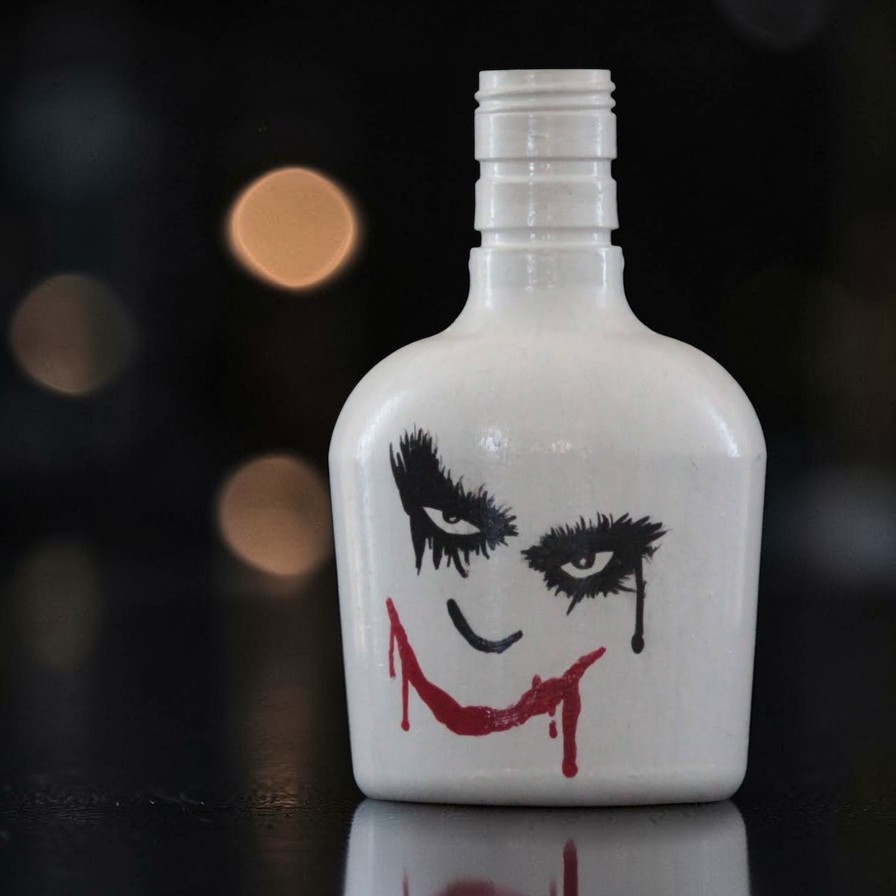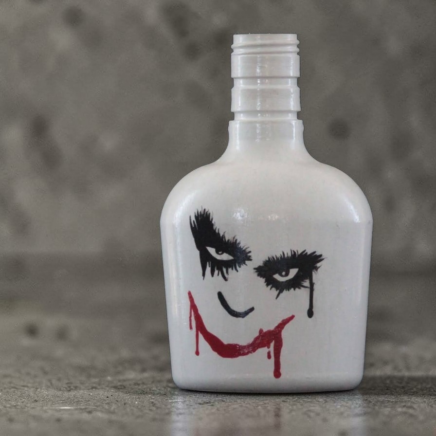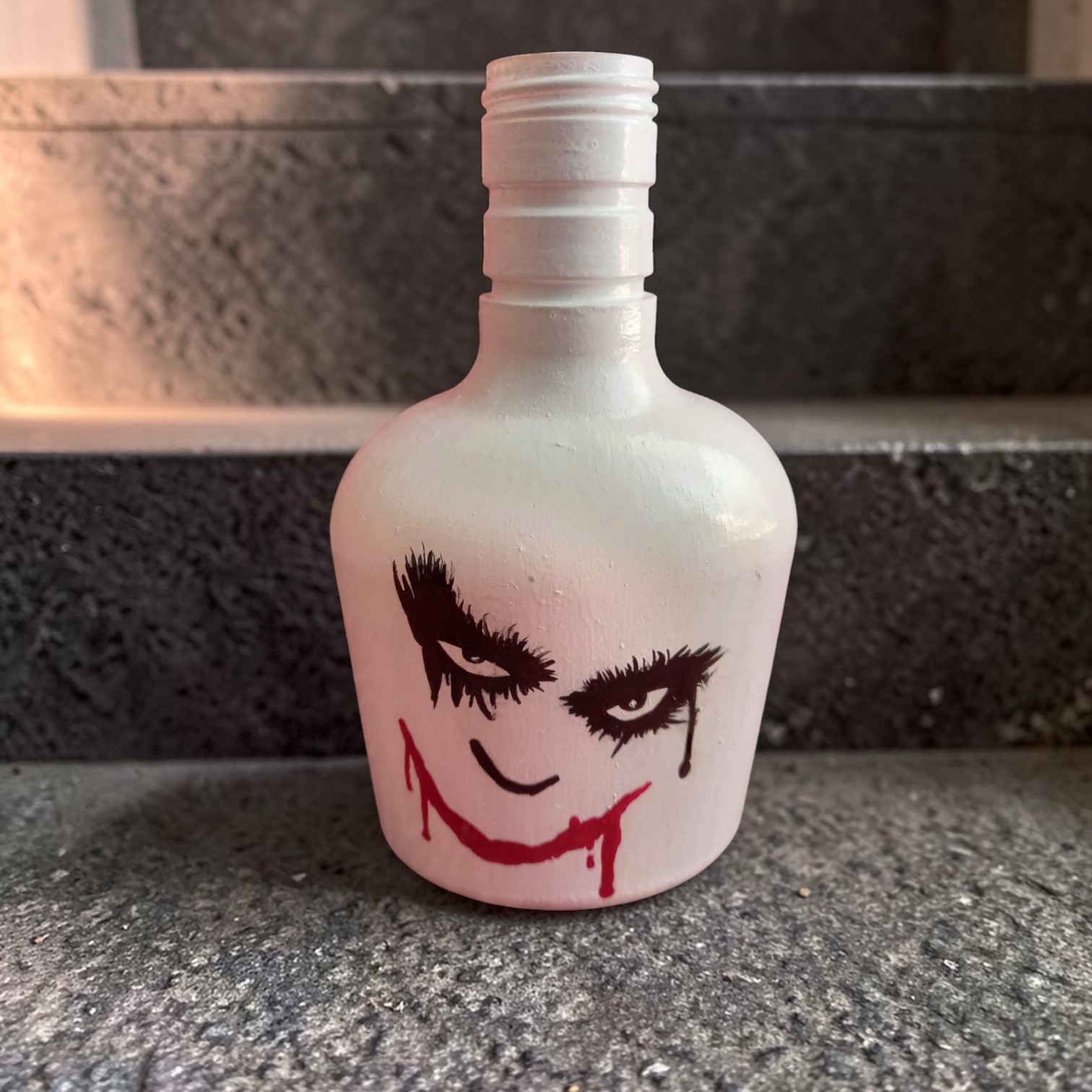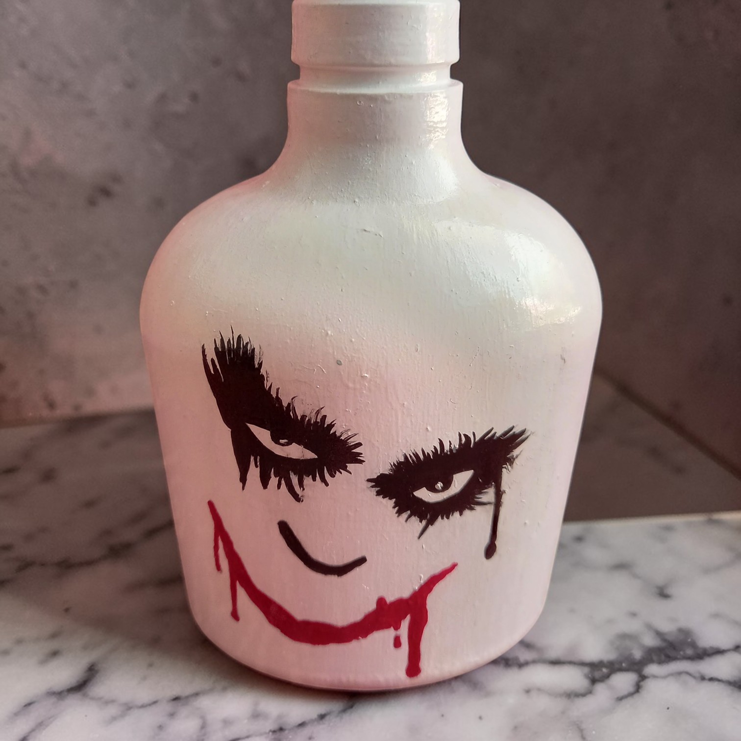 Hand-painted decorative bottle featuring a bold, edgy face design with dramatic eyes and a striking red smile. Crafted with fine detail on a smooth matte finish, this unique piece adds a modern, artistic vibe to your space. Perfect as a statement décor item, gift, or collectible for those who love unconventional and expressive art.