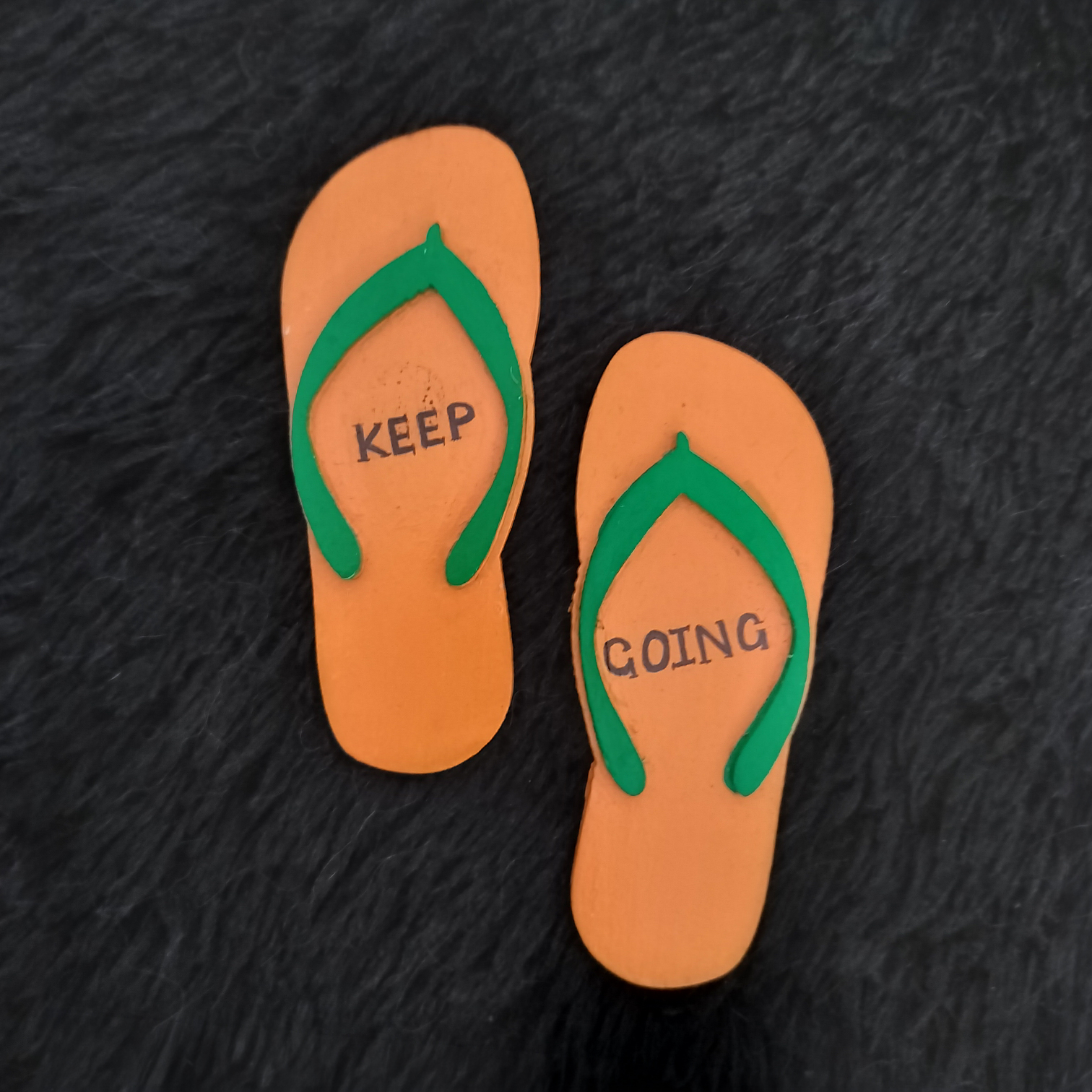 Bring a burst of color and motivation to your everyday space with this vibrant “Keep Going” flip-flop MDF fridge magnet. Handcrafted with care, this quirky slipper-shaped magnet features a bold orange base paired with contrasting green straps, making it a lively addition to your fridge or workspace.
